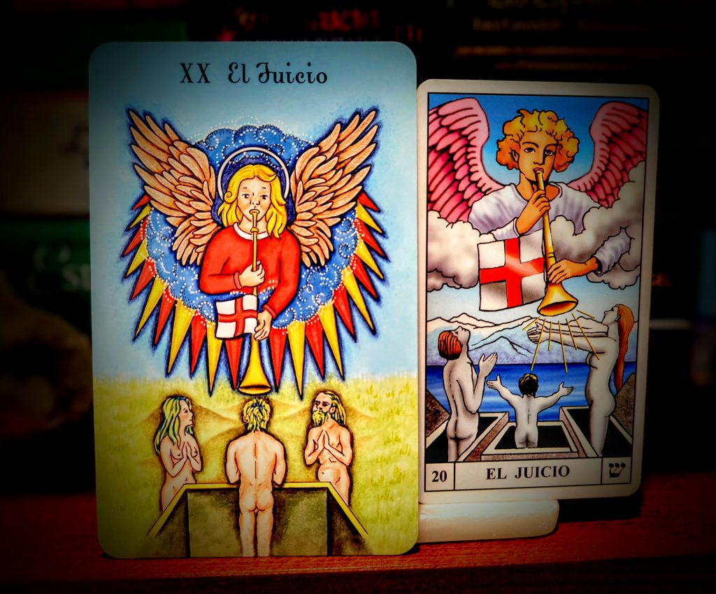En términos simbólicos, El Juicio suele representarse como una figura central, a menudo un ángel o ser divino, que toca una trompeta. A su alrededor, pueden observarse figuras emergiendo de tumbas o sarcófagos, simbolizando el renacimiento y la renovación espiritual. La imagen refleja la idea de una llamada a la acción, un despertar de la conciencia y la necesidad de enfrentar las consecuencias de nuestras acciones.