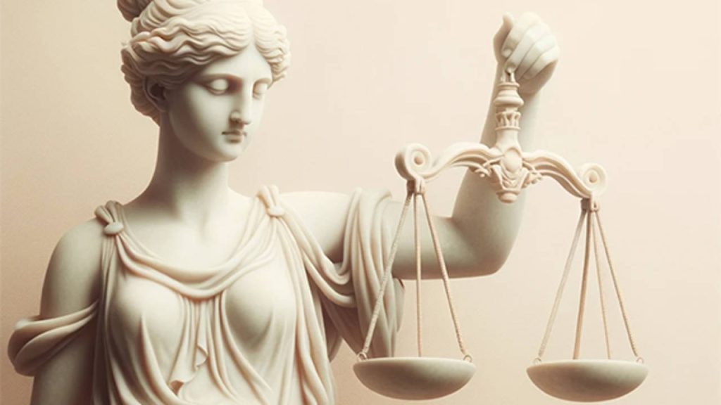 La Justicia suele representarse como una figura femenina sentada en un trono, sosteniendo una espada en una mano y una balanza en la otra. La espada simboliza el poder de la razón y la lógica, mientras que la balanza representa el equilibrio y la imparcialidad en la toma de decisiones. Detrás de ella, a menudo hay un velo que simboliza la sabiduría y la verdad oculta.